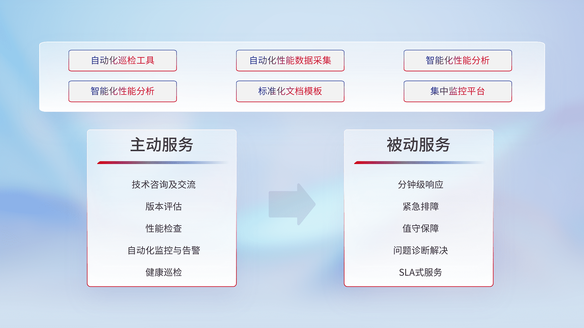 智能化工具和标准化文档,,保障服务质量,,,,提供主动服务(包含技术咨询、、、版本评估、、、性能检查、、、、自动化监控与告警、、健康巡检)和被动服务包含(分钟级响应、、、、紧急排障、、、值守保障、、、、问题诊断解决、、、SLA服务)。。。