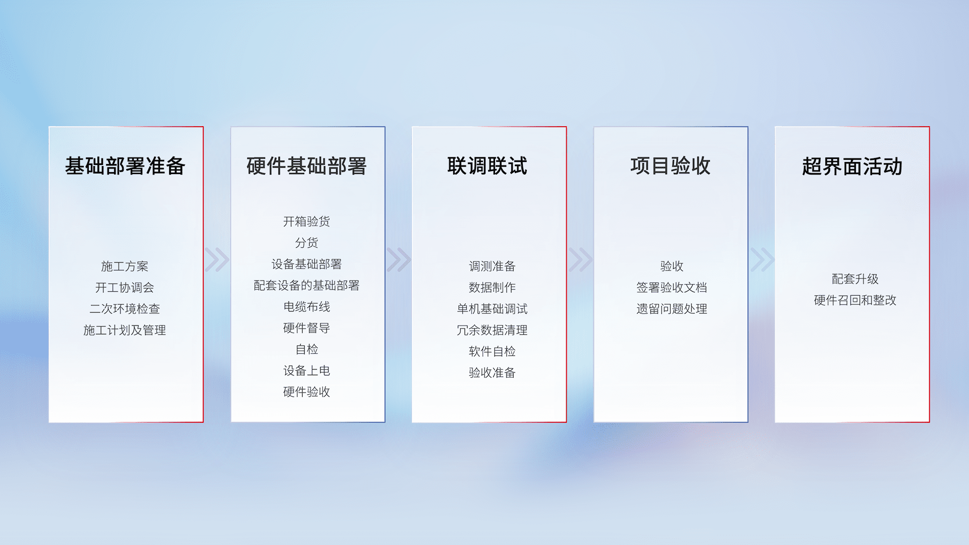 从基础部署准备、、硬件基础部署、、、联调联试、、、、项目验收、、、、越界面活动的全过程可追溯,,保证施工质量和进度。。